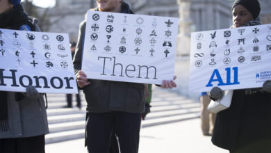 Before the arguments began, people from both sides gathered at the front of the Supreme Court on the chilly but sunny winter morning. The memorial’s opponents held aloft placards or wore hats or buttons with the words “#honor them all” and spoke about importance of not singling out the Christian faith tradition for a memorial when people of many faiths have fought and died in battles. Those gathered in support of the monument, many older men in American Legion caps, insisted that the memorial had nothing to do with religion.