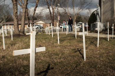 A woman and child walk Jan. 27, 2019, near crosses on the lawn of St. Thomas Aquinas Parish in Cookeville, Tenn., which were placed there to remember those lost to abortion everyday in the United States. In Tennessee, a bill to ban most abortions once a fetal heartbeat is detected is to be taken up soon by the full House. (CNS photo/Rick Musacchio, Tennessee Register)