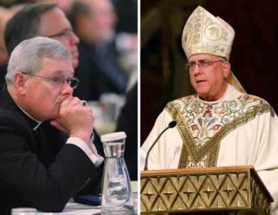 Bishop David J. Malloy of Rockford, Ill., chairman of the U.S. Conference of Catholic Bishops’ Committee on International Justice and Peace, and Archbishop Joseph F. Naumann of Kansas City, Kan., chairman of the U.S. bishops’ Committee on Pro-Life Activities, are seen in this composite photo. (CNS composite; photos by Bob Roller and Gregory A. Shemitz)